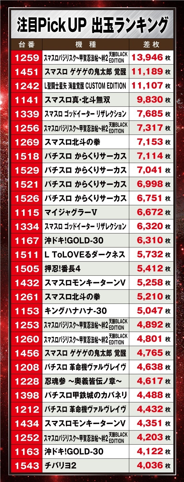 なんといってもこの日は『スマスロバジリスク~甲賀忍法帖~絆2 天膳BLACK EDITION』が大盛況!! 出玉ラインキング1位になった1259番台の+13,946枚をはじめ、+7,000枚超が1台、+4,000枚超が3台という活況っぷりであった。