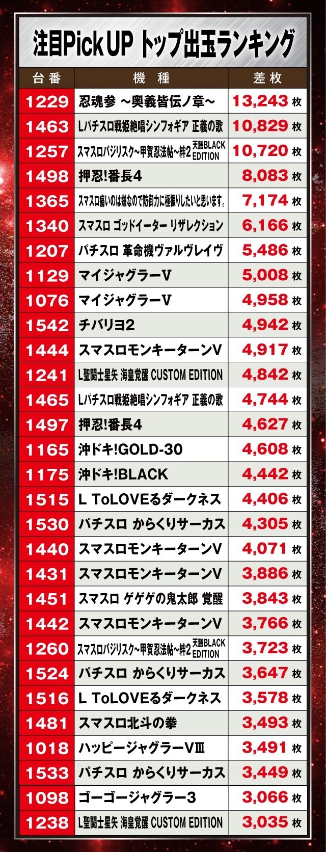 早速、店内の様子をチェックしてみると、この日は万枚超が3台も出現!! 特に盛り上がりを見せていたのが、出玉ランキング1位になった『忍魂参 ~奥義皆伝ノ章~』で+13,243枚を叩き出しファンを喜ばせていた。