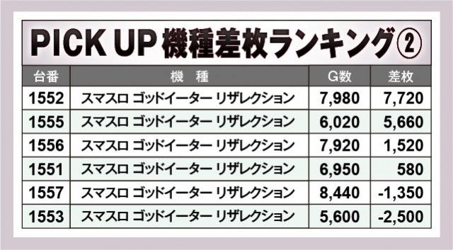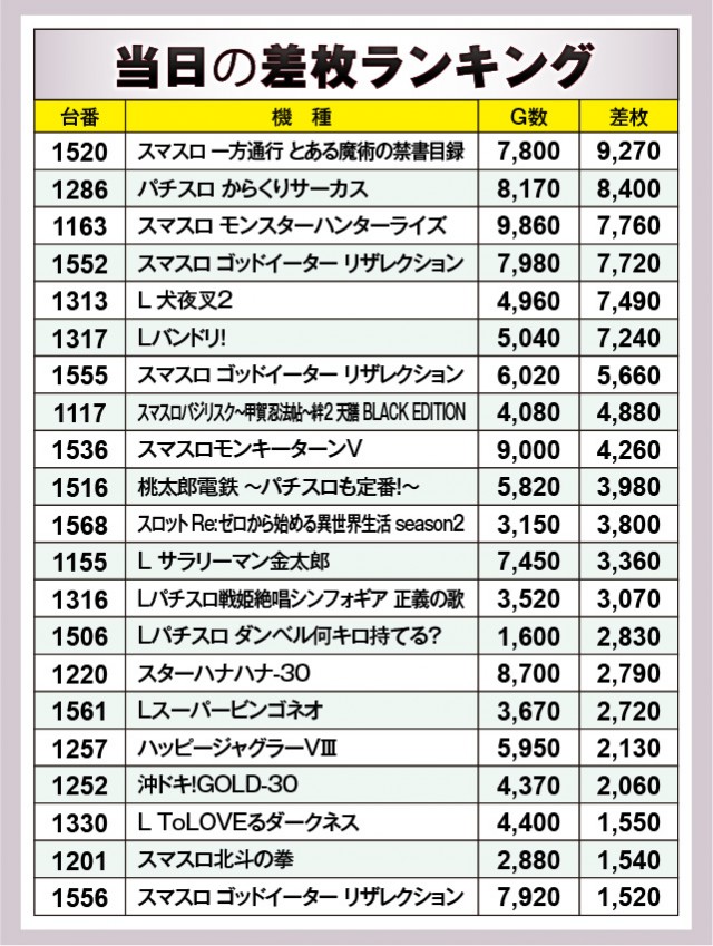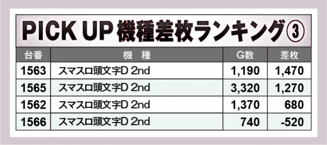 『ドラゴンハナハナ~閃光~ 30』『スマスロ ゴッドイーター リザレクション』はともに高い活気と熱気を披露しており、特に前者は全台プラス差枚数を達成するという偉業を成し遂げた。後者も7,000枚OVERと大きな熱気を放っており、遊技していたファンは口角を緩めながらレバーを叩いていたはずだ。『スマスロ頭文字D 2nd』もポテンシャルを秘めていたことから、より大きな熱気を放ってのは間違いないだろう。