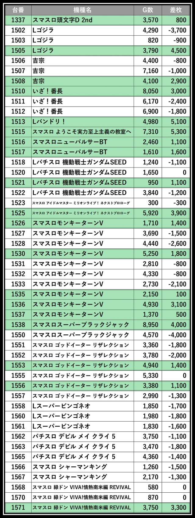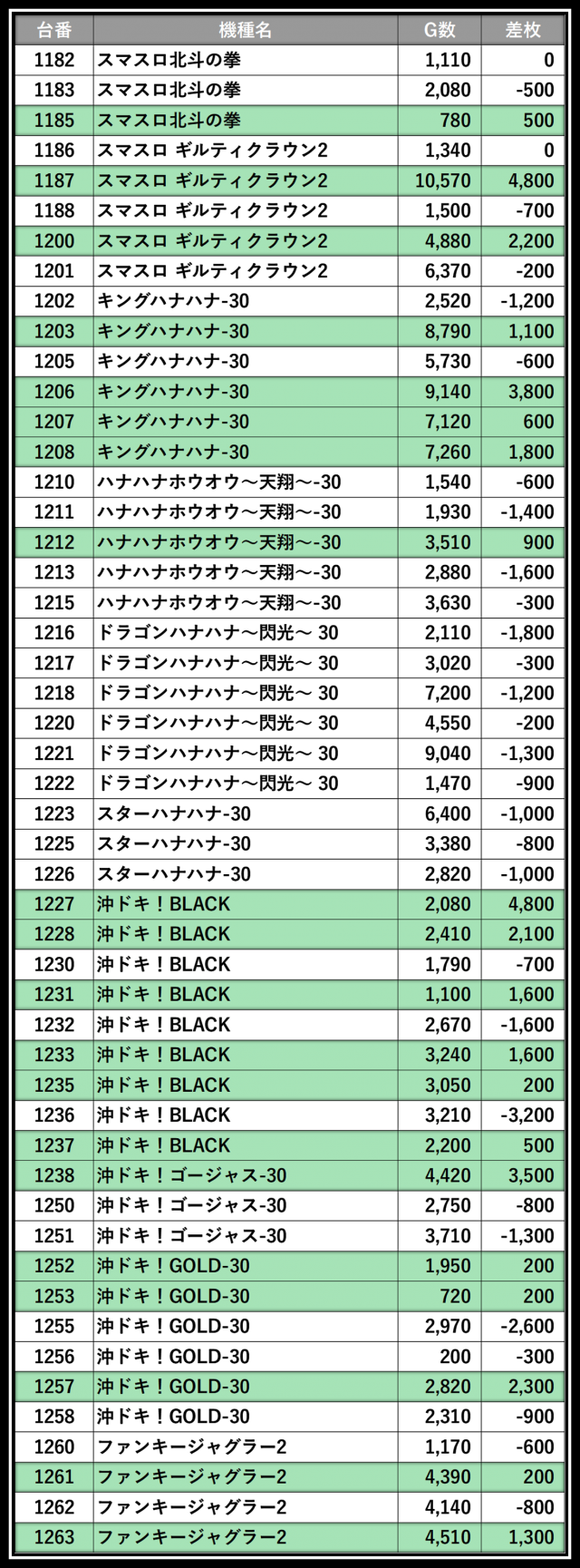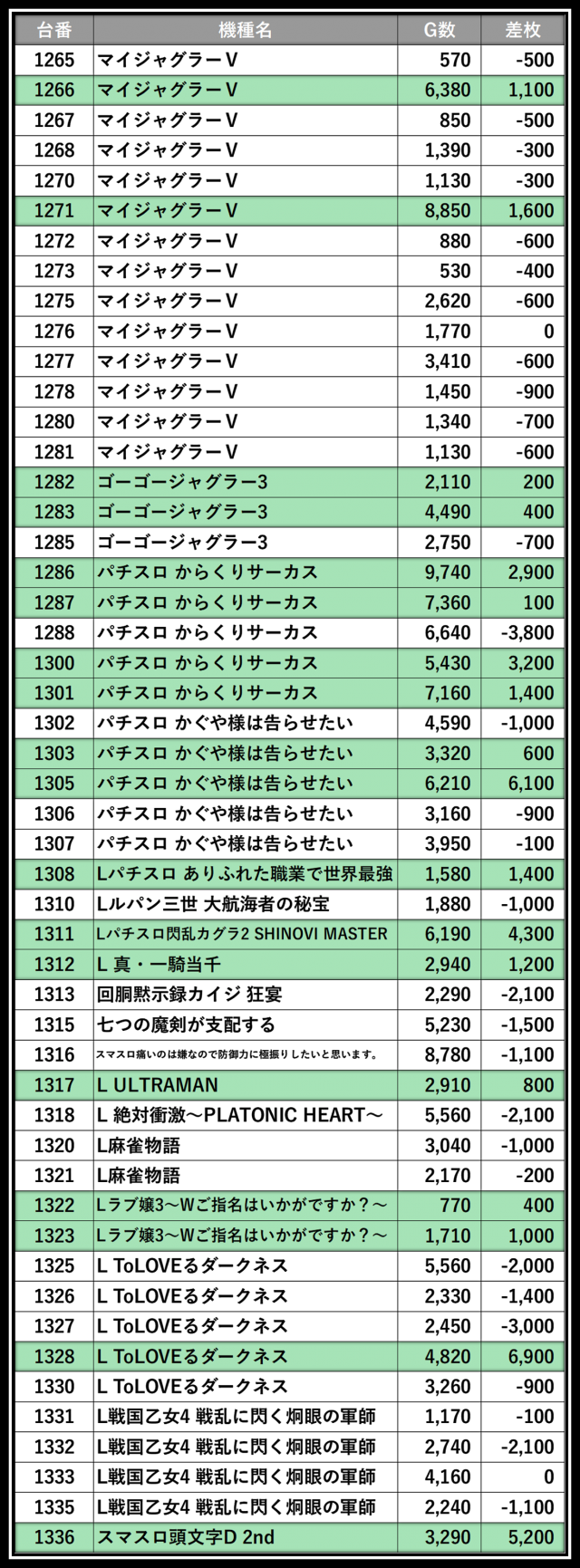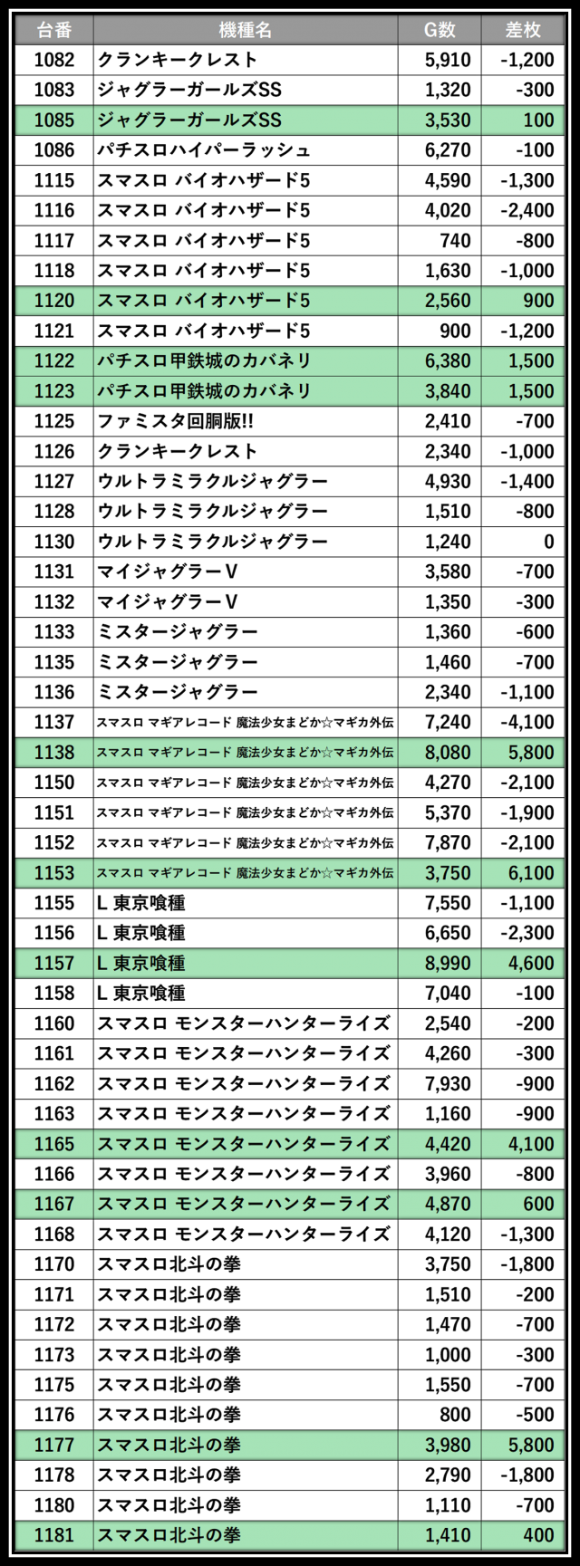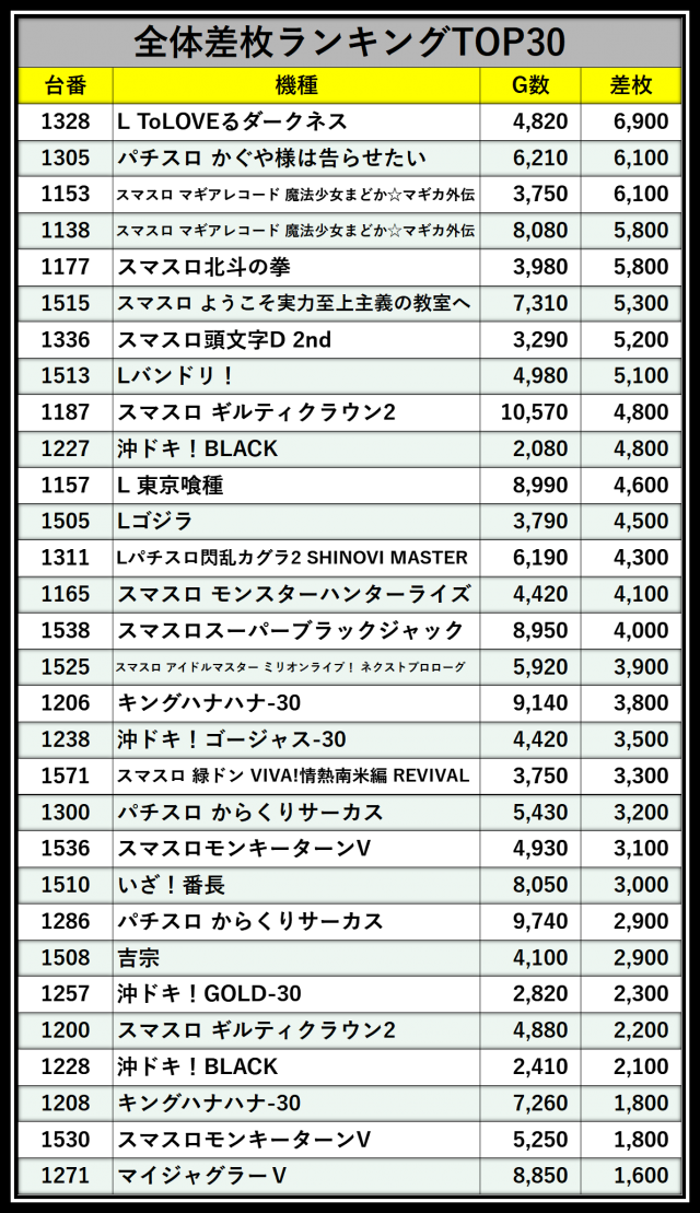 ※差枚数順に掲載しています