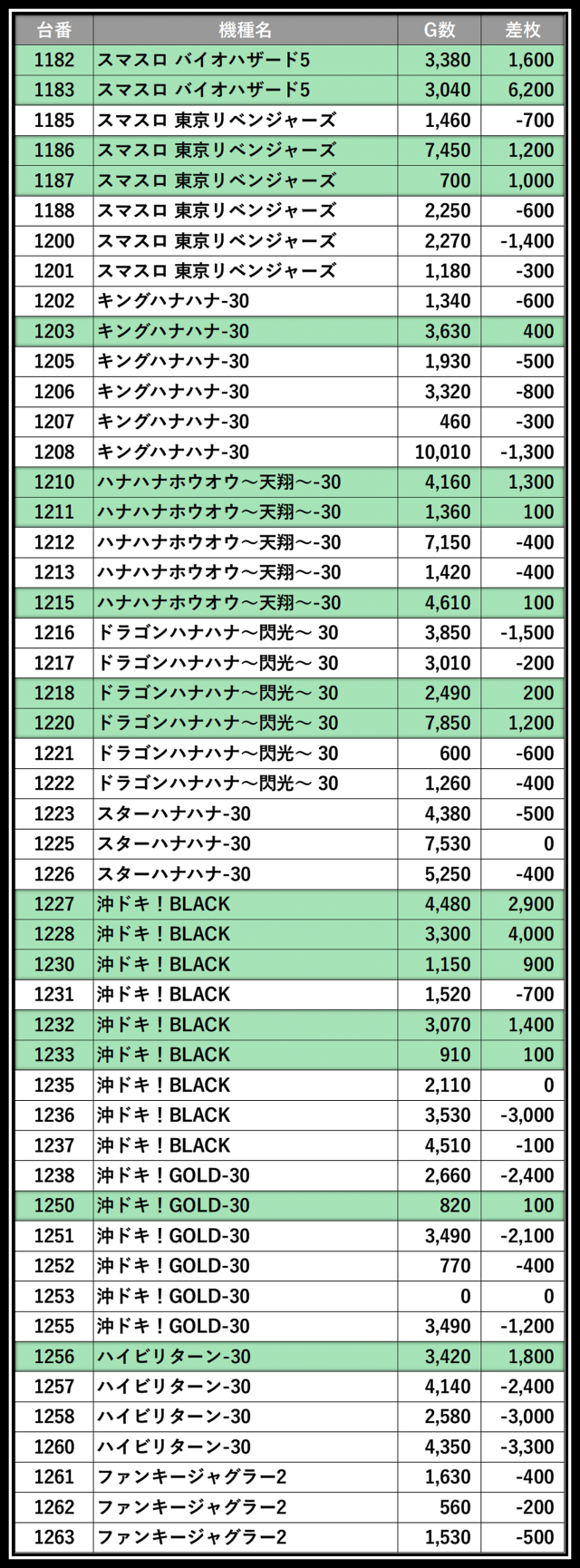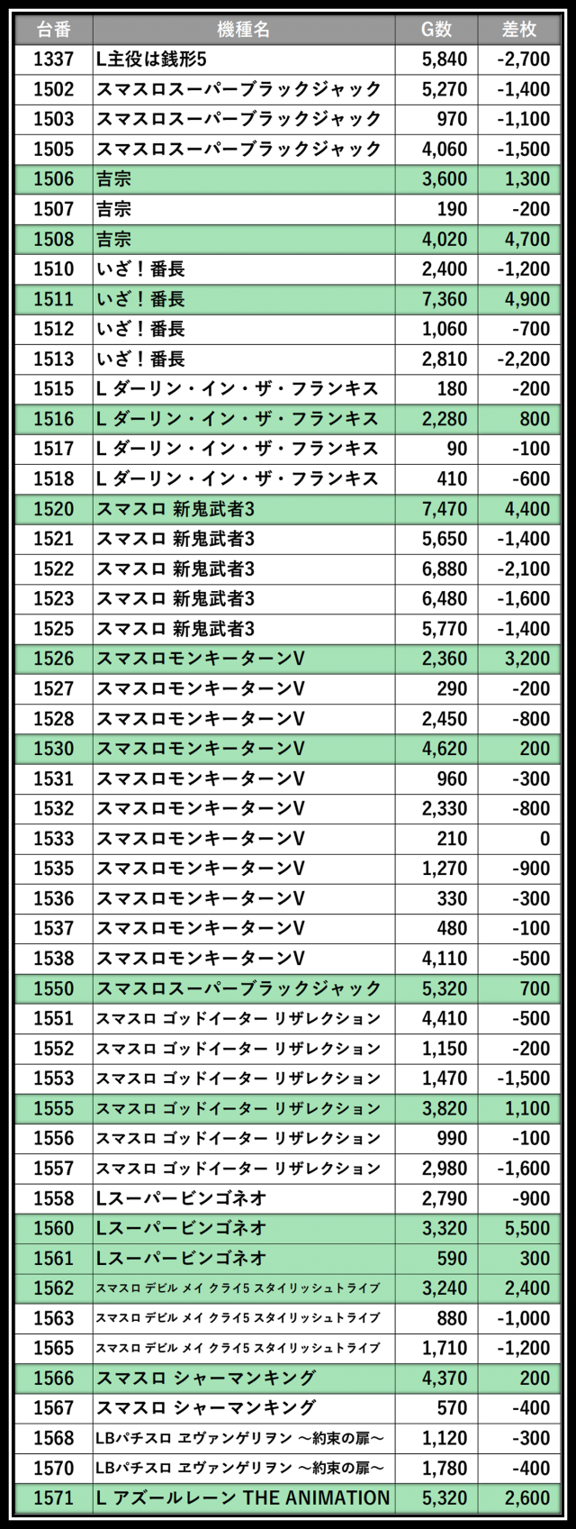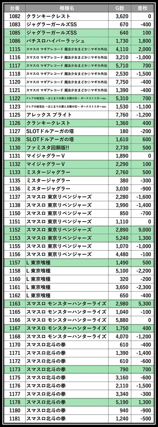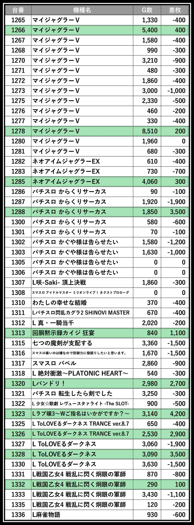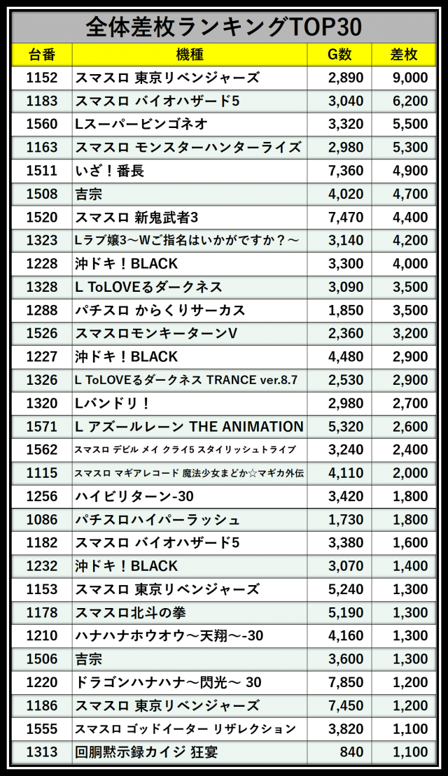 ※差枚数順に掲載しています