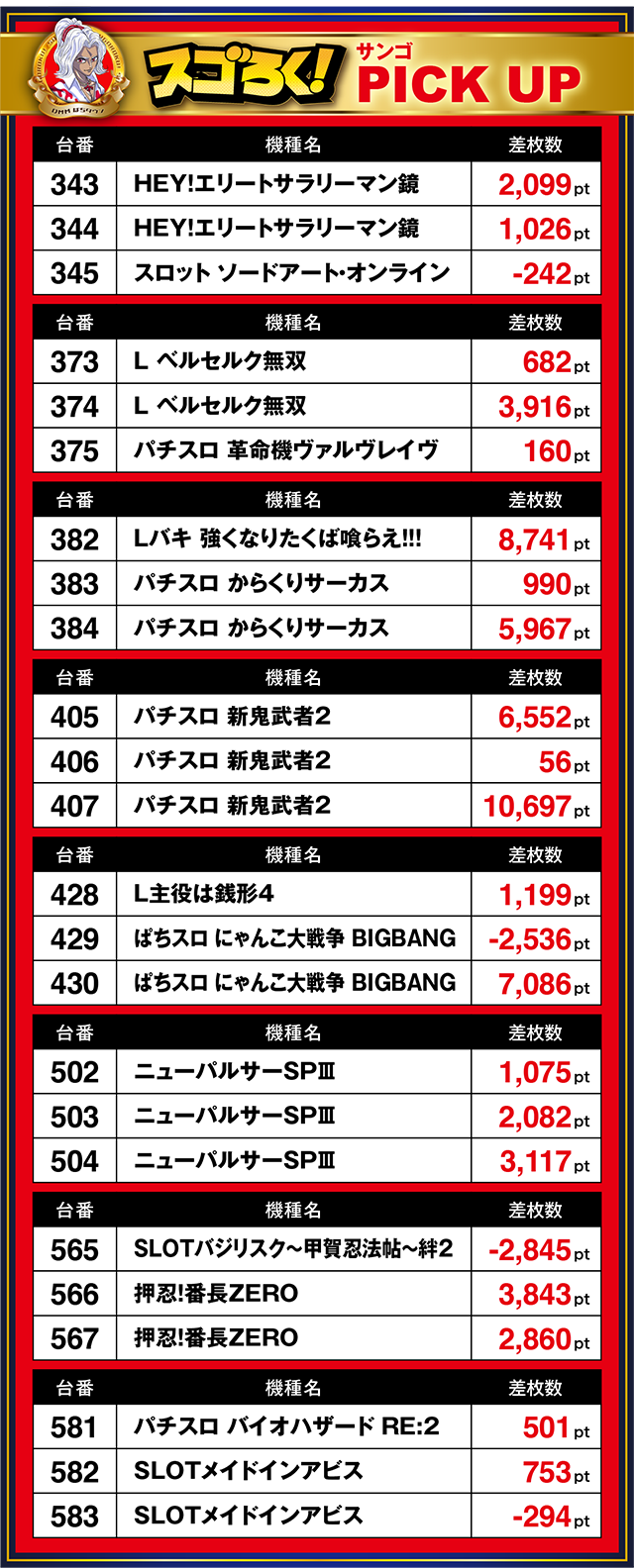 プレイヤーの活躍もあってか、全台がプラス。しかも、407番台は10,000pオーバーだ。