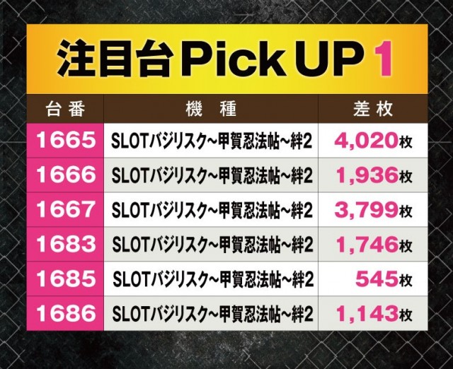 まず目についたのが『SLOTバジリスク~甲賀忍法帖~絆2』だ。6台全台がプラスの平均2,198枚と見事なまでに実力を発揮しており、多くのプレイヤーを楽しませていた。