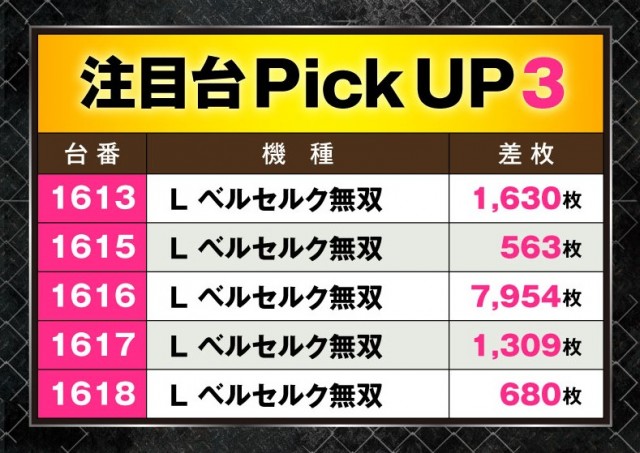さらに『L ベルセルク無双』も5台全台プラスの平均2,427枚と注目を集めるほか、なかには7,954枚の記録を残す好調台が誕生していた。