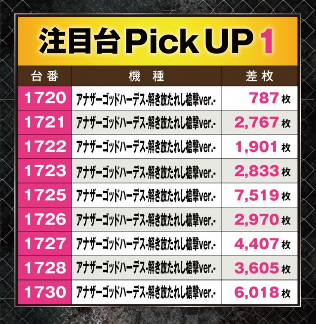 まず注目したのが『アナザーゴッドハーデス-解き放たれし槍撃ver.-』。なんと設置9台全台が好調台となっていたのだ!平均3,645枚と大盛況で、7,000枚オーバーの優秀台が出現しているのがわかる。