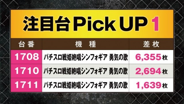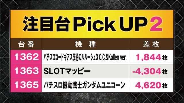 並びでは『パチスロコードギアス反逆のルルーシュ3 C.C.&Kallen ver.』『SLOTマッピー』『パチスロ機動戦士ガンダムユニコーン』の3台が選ばれた。『パチスロ機動戦士ガンダムユニコーン』は4,000枚オーバーと機種のポテンシャルを上手く発揮できていたようだ。