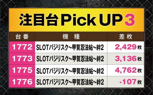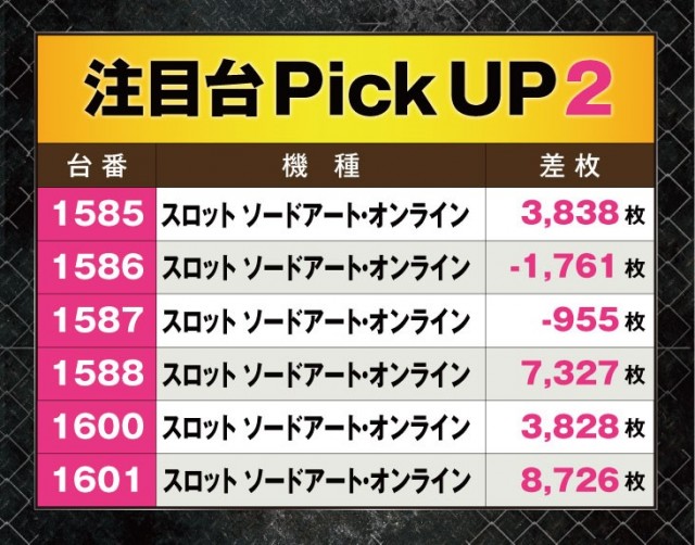 店内状況を見ると、並びと全台系で好調台が目に付く結果となった。特に全台系の2機種が注目を集めており、『スロット ソードアート・オンライン』は平均+3,501枚と大盛況。8,000枚、7,000枚越えという見事な活躍ぶりも確認している。さらに『SLOTバジリスク~甲賀忍法帖~絆2』も平均+2,555枚と圧巻で、周囲の注目を集めていた。