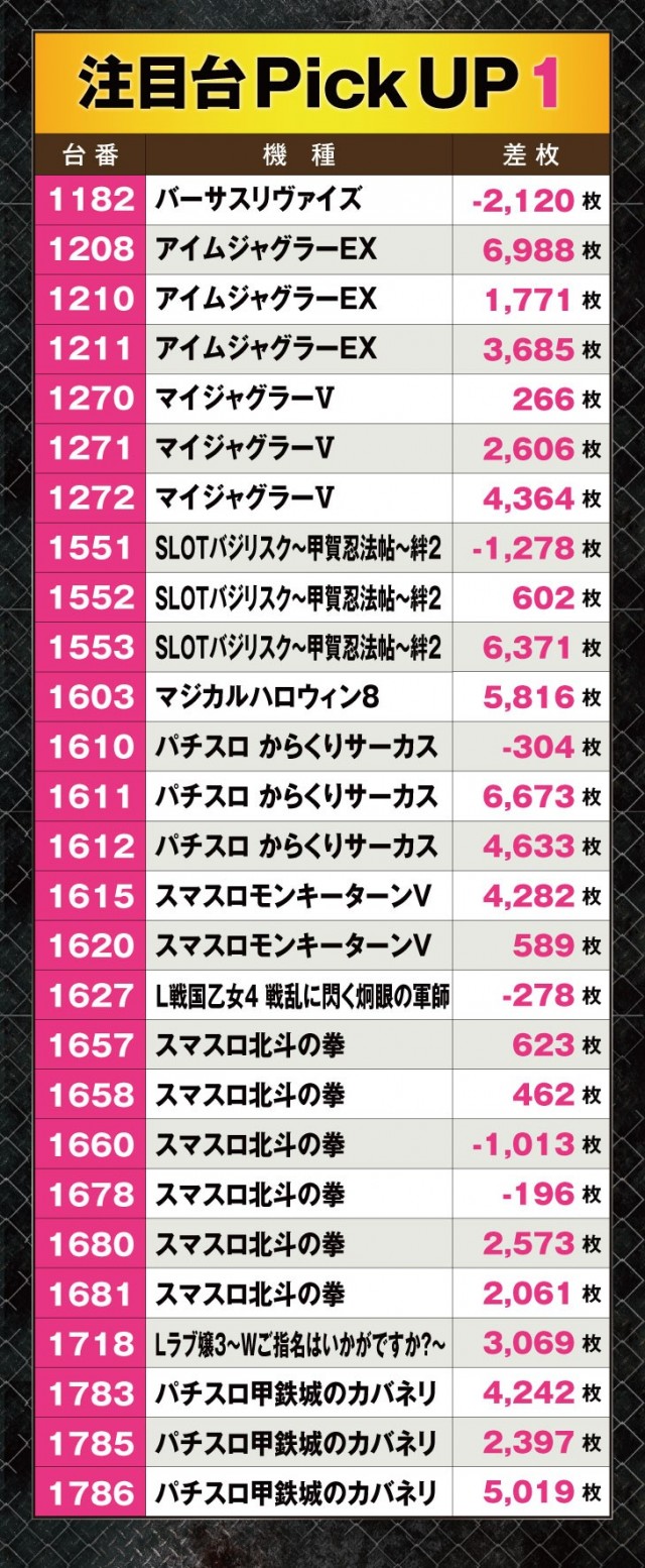 次に並びを見てみると、そこかしこで機種性能を引き出す好調台が見受けられた。『アイムジャグラーEX』は平均+4,148枚、『パチスロ甲鉄城のカバネリ』平均+3,886枚、『パチスロ からくりサーカス』平均+3,667枚と、大いに活気が感じられた!