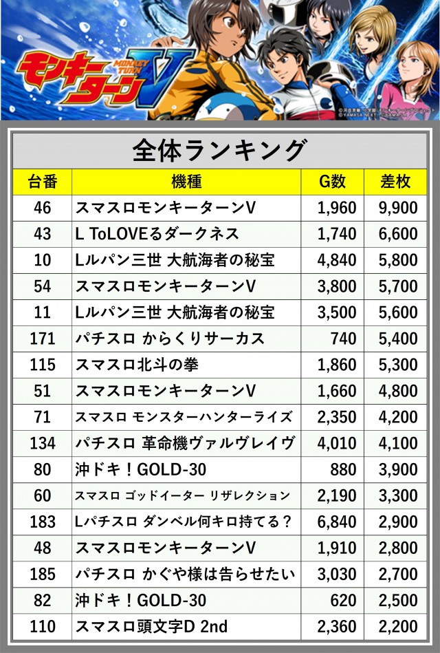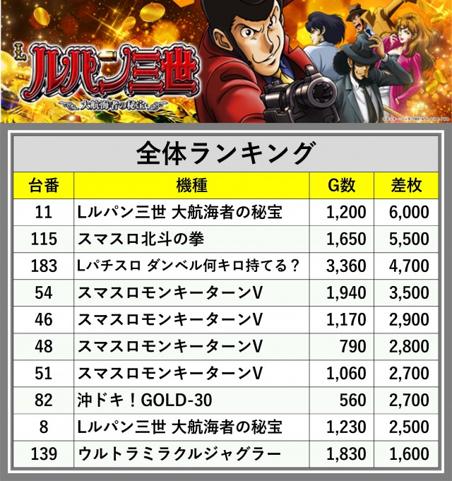 厳選された取材対象機種をはじめ、その他スロット全体から好記録が飛び出した!プレイヤーが楽しんだ1日を下記データにて振り返ってみて欲しい。
