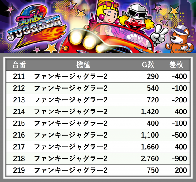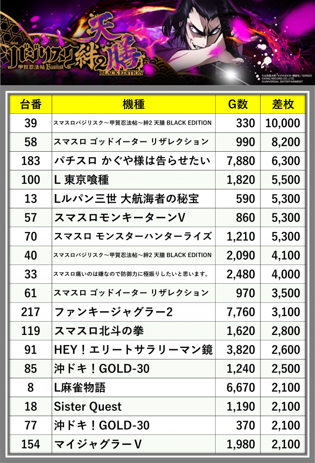 厳選された取材対象機種をはじめ、その他スロット全体から好記録が飛び出した!プレイヤーが楽しんだ1日を下記データにて振り返ってみて欲しい。