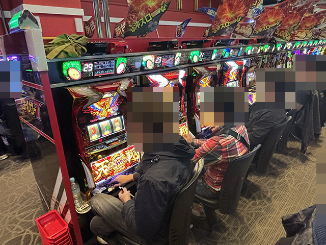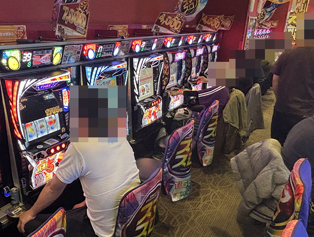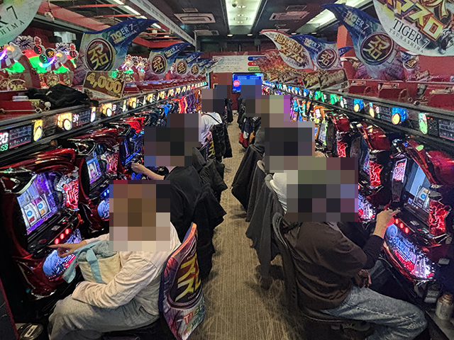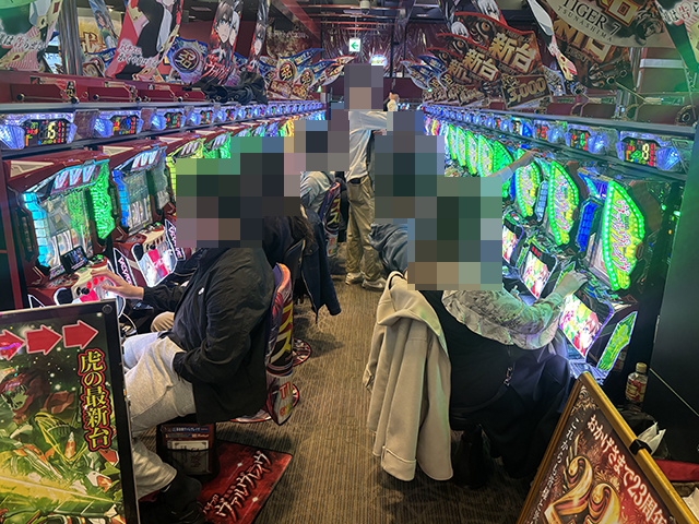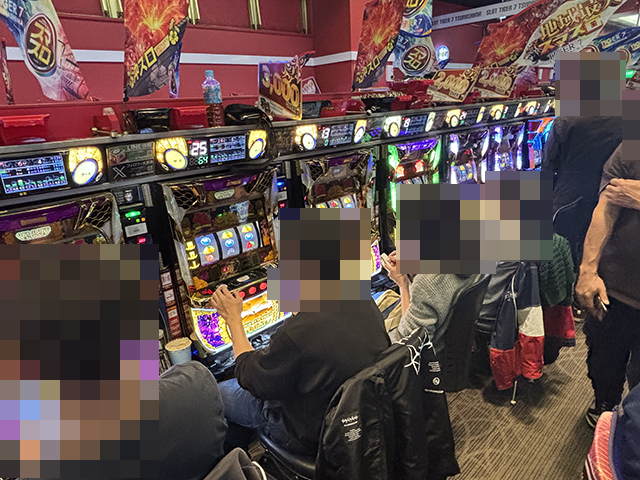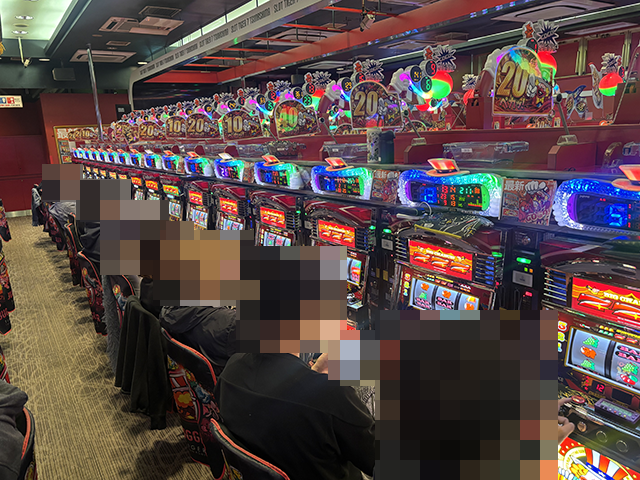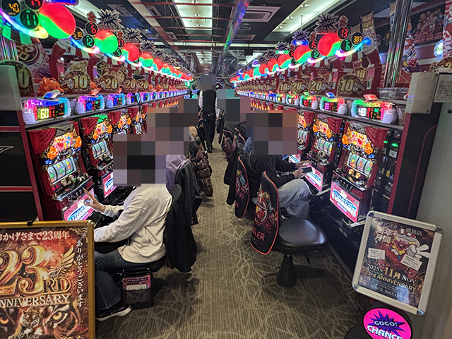 ちょうど23周年を迎えたパチスロ専門店であり、店内にはたくさんのプレイヤーが集まっていた。