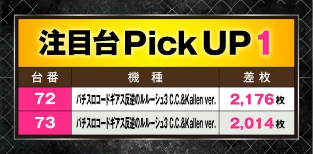 今回も店内状況で目に付いたのは全台系。『パチスロコードギアス反逆のルルーシュ3 C.C.&Kallen ver.』は2台とも絶好調で、平均2,095枚と凄まじい結果を残している。