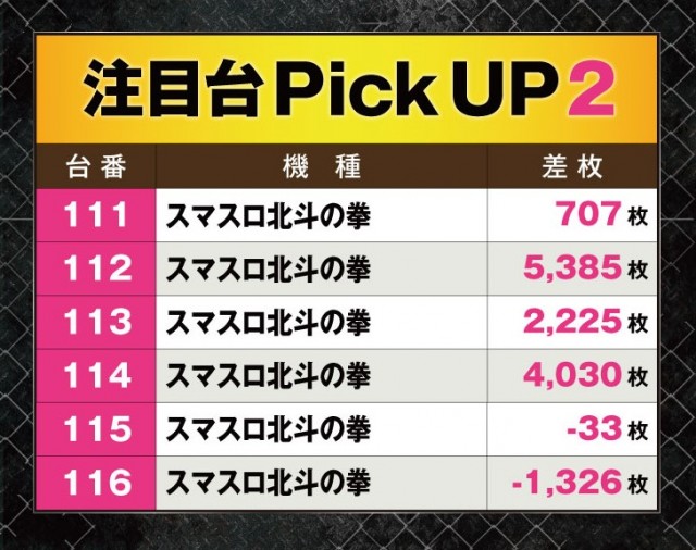 『スマスロ北斗の拳』は 2台マイナスとなったものの5,000枚、4,000枚オーバーなど見事な活躍もあり、全体平均1,831枚とこちらも大盛況だった。