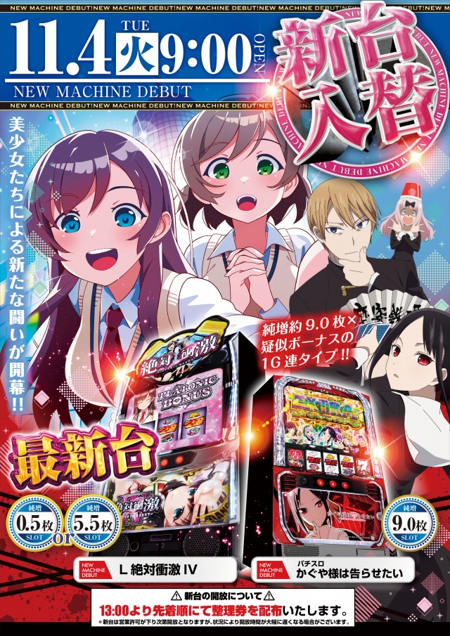 開店時入場【パチンコ】駐輪場側入口【スロット】正面入口(綱島街道側)となります。※入場整理券を配布する場合は、各入場口で8:30よりお配りいたします... |