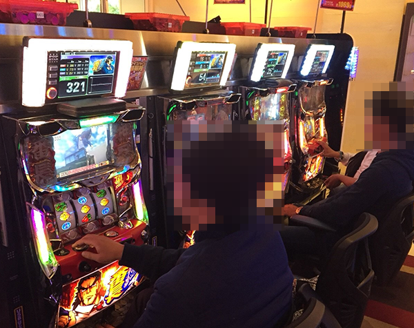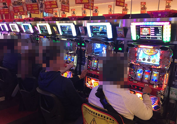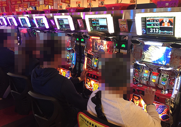 設置されている4台すべてが稼働しており、ほぼ全員が持ち玉で遊技を楽しんでいる「押忍!サラリーマン番長」に注目した。