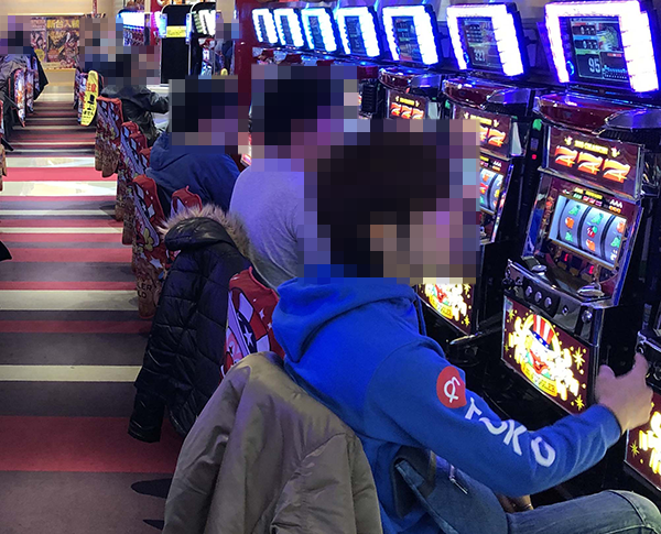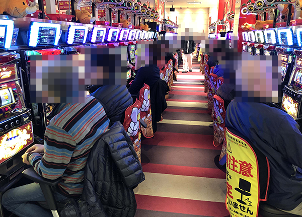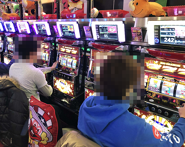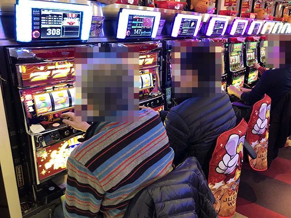 パチスロコーナーで龍の存在を探っていると、さまざまな機種で活躍するプレイヤーたちを目撃。あちこちに華やかな光景が広がっており、フロア全体が活気づいていた。