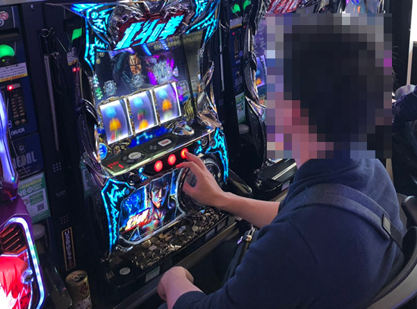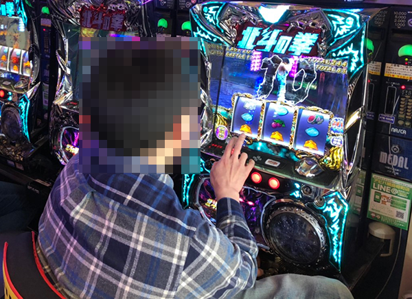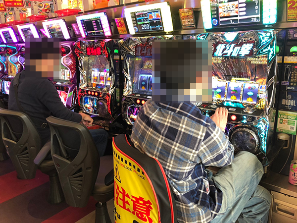 カウンターを背にして各シマをみていくと、パチスロコーナーの機種構成がバラエティに富んだシマから盛り上がりを感じた。さまざまなスペックの機種に目を向けたなかで、とくに活気のある光景が広がっていたのは「パチスロ北斗の拳 修羅の国篇」だ。