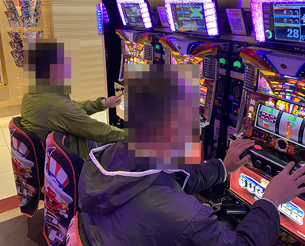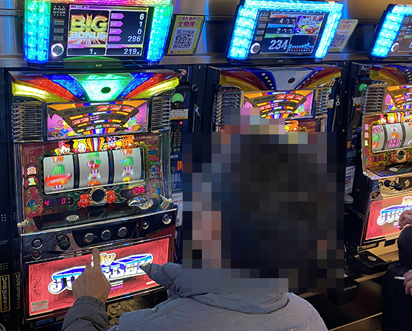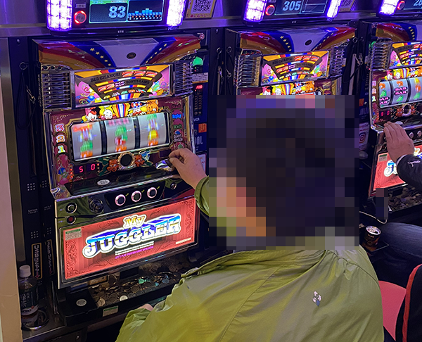 さまざまな場所が明るいムードに包まれている店内では、パチスロコーナーがとくに活況。いくつもの機種で楽しそうな姿を目にしたが、とくに興味をひかれたのが「マイジャグラーⅢ」だ。
