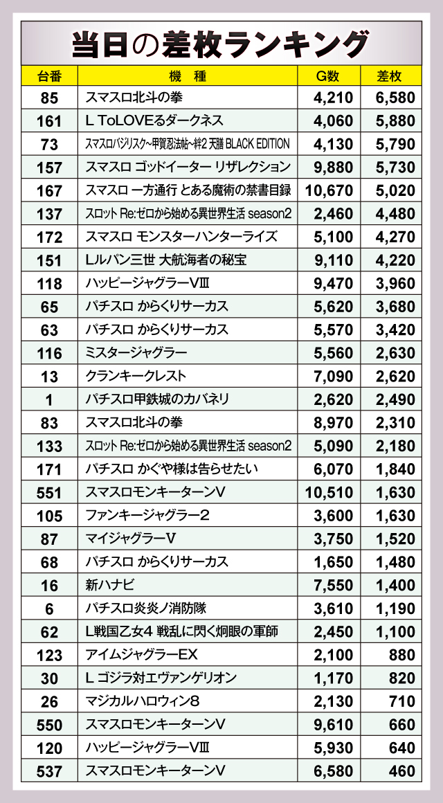 首位を獲得したのは『スマスロ北斗の拳』。85番台が+6,580枚と申し分ない結果を残した。それ以外に+5,000枚を突破したのは4台。『L ToLOVEるダークネス』161番台が+5,880枚、『スマスロバジリスク~甲賀忍法帖~絆2 天膳 BLACK EDITION』73番台が+5,790枚、『スマスロ ゴッドイーター リザレクション』157番台が+5,730枚、『スマスロ 一方通行 とある魔術の禁書目録』167番台が+5,020枚となっている。