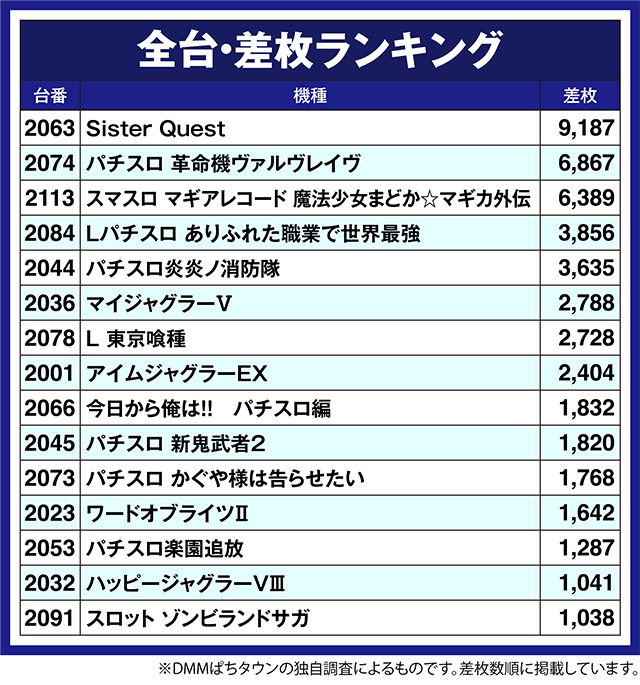 6,300ptを超えた台は、「パチスロ 革命機ヴァルヴレイヴ」と「スマスロ マギアレコード 魔法少女まどか☆マギカ外伝」にもアリ。