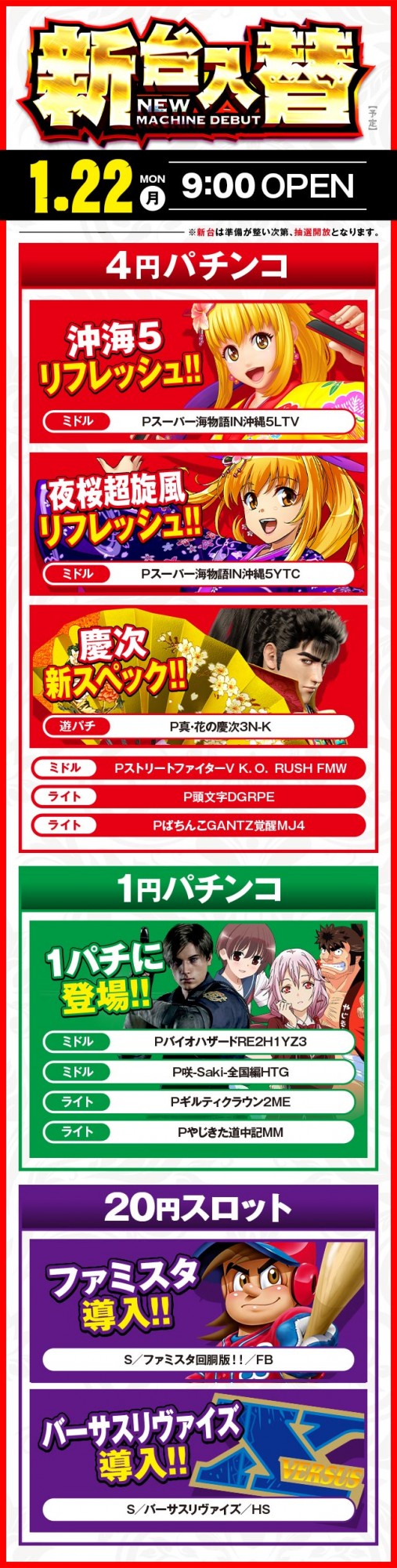 【パチンコ】並び順入場 8:30~整理券配布 【スロット】抽選入場 8:30抽選を行います。 |