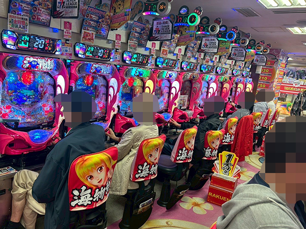 14時半ごろの4円パチンコでは「Pスーパー海物語 IN 沖縄5」や「PA大海物語5ブラックLT99ver.」といった海物語シリーズが人気で、プレイヤーの嬉しそうな様子を多数確認している。