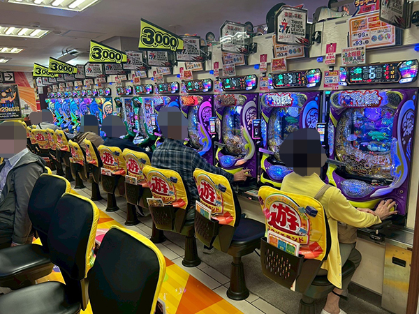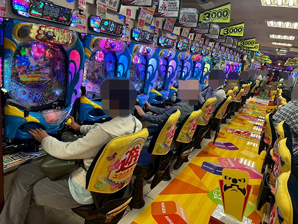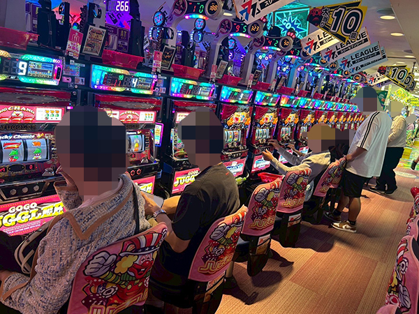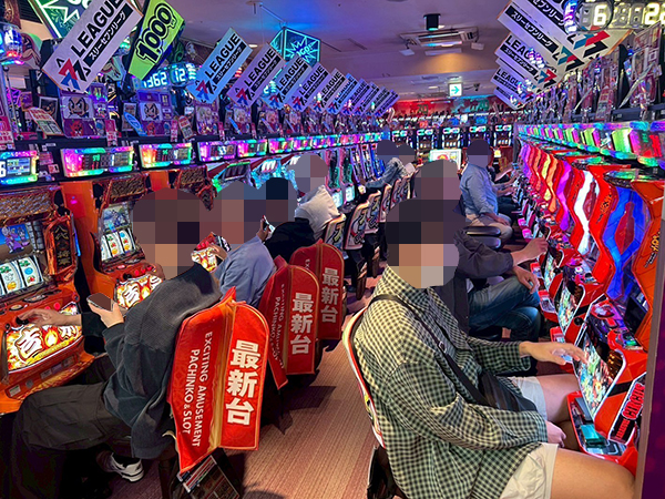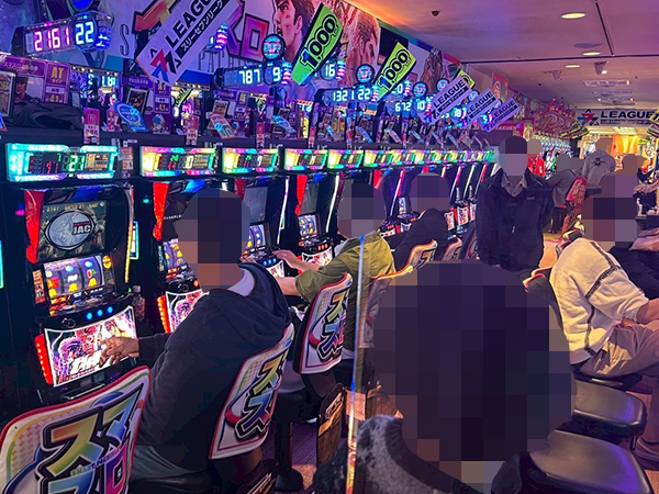 取材時は多くのプレイヤーが来店。パチンコ・パチスロともに、様々な機種が支持を得ていた。