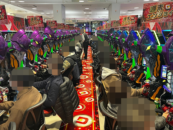 14時半ごろの4円パチンコでは「新世紀エヴァンゲリオン〜未来への咆哮〜」や「eフィーバー戦姫絶唱シンフォギア4 キャロルver.」で好調なプレイヤーが多数見受けられ、時折見せる嬉しそうな表情が印象に残っている。