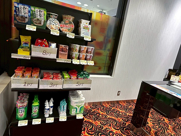 景品コーナーには日用品・インスタント食品・ドリンク類など多彩なアイテムが揃っており、プレイヤーたちの目を引いていた。