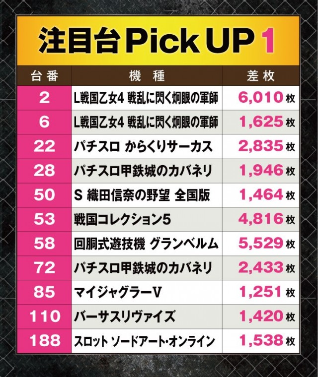 店内状況を見ると、様々な場所で好調台が目に付く結果となった。『L戦国乙女4 戦乱に閃く炯眼の軍師』の6,010枚を筆頭に『回胴式遊技機 グランベルム』で5,529枚、『戦国コレクション5』で4,816枚といった見事な活躍ぶりを目にしている。