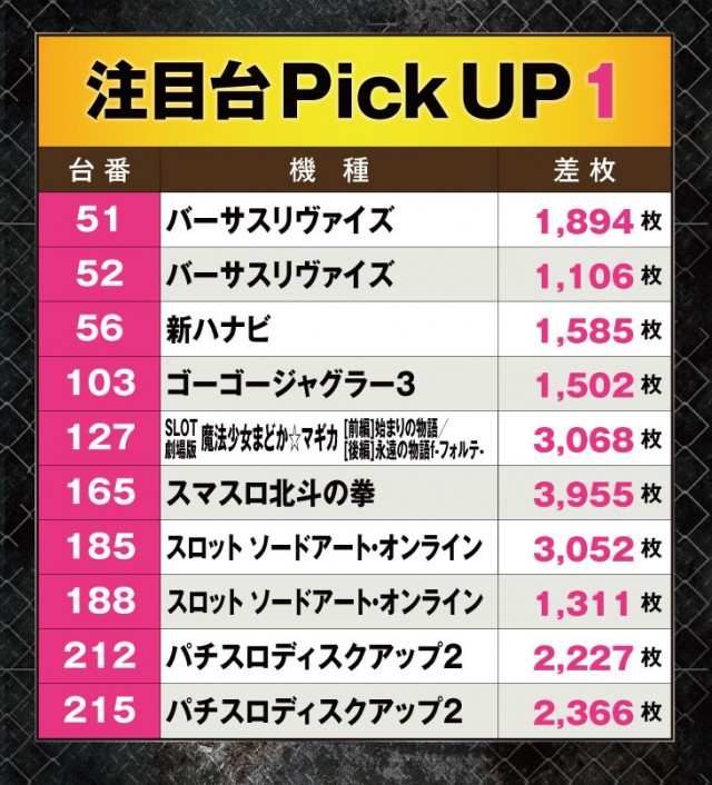 今回は『スマスロ劇場版 魔法少女まどか☆マギカ[前編]始まりの物語/[後編]永遠の物語f-フォルテ-』や『スマスロ北斗の拳』、『スロット ソードアート・オンライン』といった、スマスロを中心に好調台の見事な活躍ぶりを確認している。
