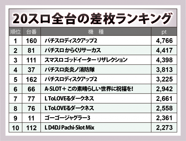 惜しいことに+5千オーバーとなる台はカウントできなかったが、『パチスロ からくりサーカス』『スマスロ ゴッドイーター リザレクション』といったスマスロが+4千超を成し遂げ、その他では『パチスロ炎炎ノ消防隊』『A-SLOT+ この素晴らしい世界に祝福を!』などにも好調台が生じていた。