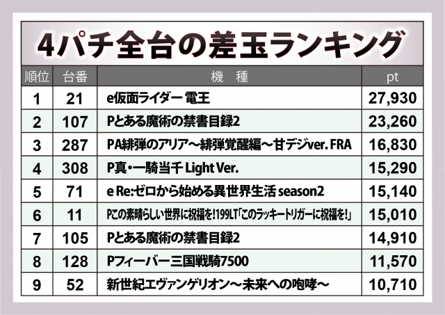 1回目に続いて『e 仮面ライダー電王』が+2万8千弱の差玉で全台の頂点に輝き、さらに『Pとある魔術の禁書目録2』が2台入賞し、『PA緋弾のアリア~緋弾覚醒編~甘デジver. FRA』『P真・一騎当千 Light Ver.』といった甘デジスペックがその実力を十分に発揮した。