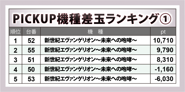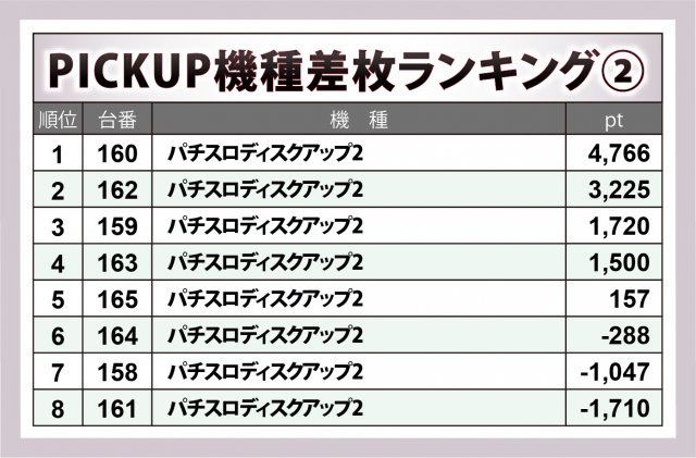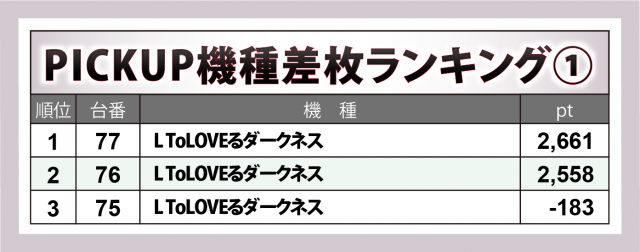 『L ToLOVEるダークネス』『パチスロディスクアップ2』どちらも、勝利台の方がマイナス台を上回った。また後者は初回の上位14台に複数ランクインし、今回も+4千8百弱・+3千3百弱が1台ずつ輩出されていることから、同店において見逃せない機種と言えるかもしれない。