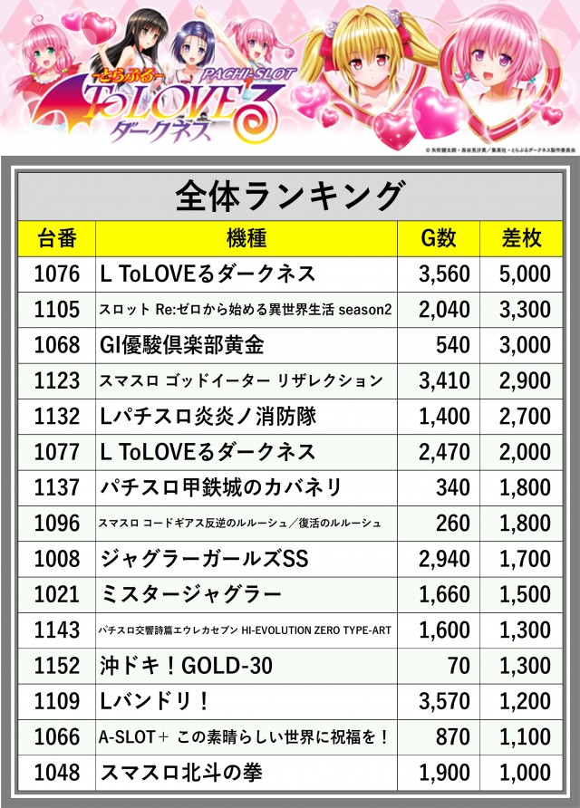厳選された取材対象機種をはじめ、その他スロット全体から好記録が飛び出した!プレイヤーが楽しんだ1日を下記データにて振り返ってみて欲しい。