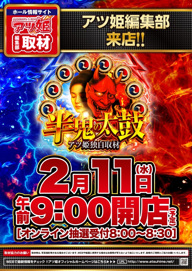 2月11日(水)半鬼の太鼓!アツ姫編集部来店!午前9時開店!
