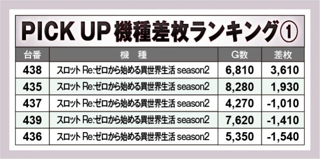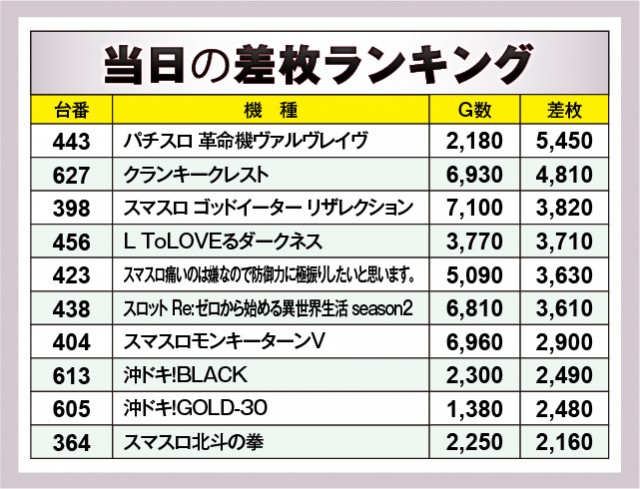 上表の優秀機種には人気機種が名を連ねており、『パチスロ 革命機ヴァルヴレイヴ』から5,000枚OVERと大きな熱量が見られる。そして新台『スロット Re:ゼロから始める異世界生活 season2』もさっそく活躍しており、ファンの心を鷲掴みにしていたことだろう。またメダル機も存在感を放っていたのが印象的で、『クランキークレスト』から4,000枚OVERが放たれ、『沖ドキ』シリーズも熱気を放っていた。