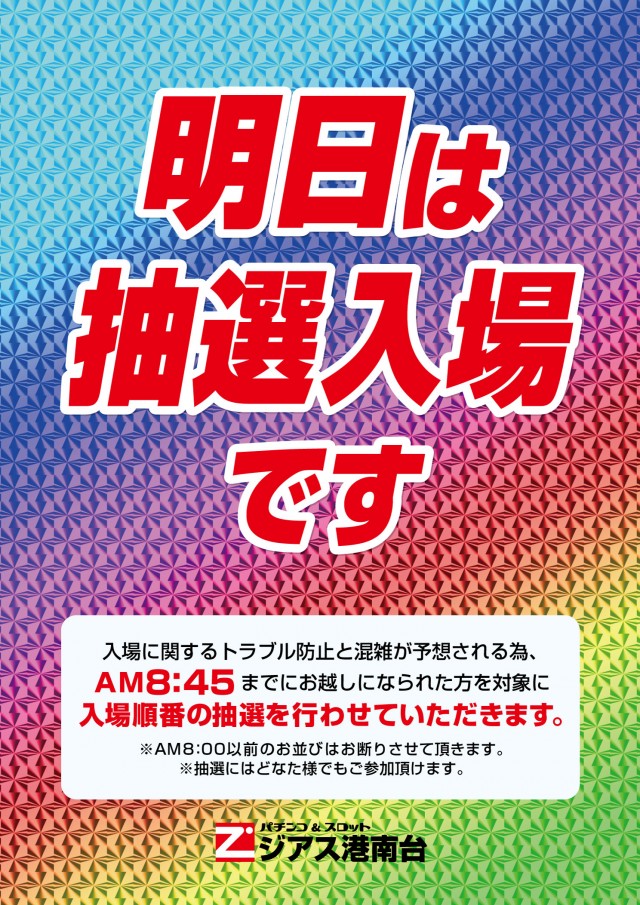 本日は抽選入場!【入場抽選8:45~】是非ご来店下さい!!