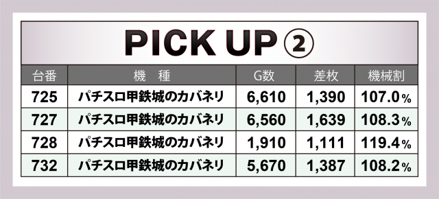 『スマスロ北斗の拳』では+4千9百枚超の台を筆頭に3台で+9千枚目前をマーク。また『パチスロ甲鉄城のカバネリ』4台は合計+5千5百枚超の結果を残した。