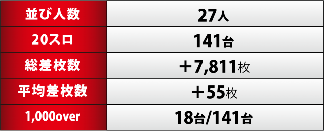今回、[1000円/46枚]スロ141台のトータル差枚数は+7,811枚と、プラスには成功したものの5桁には届かなかった。また、前述した通り1,000overは30台を達成できず全体の2割以下となり、正直言って他店取材のレベルと比べると物足りなさを感じる結果に終わってしまった。