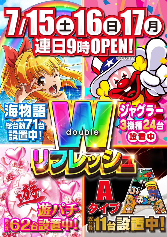3連休リフレッシュオープン人気機種好評稼働中🌈9時開店🌈🌈