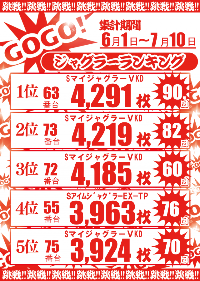本日7月22日ジャグランキング更新!人気機種好評稼働中♪