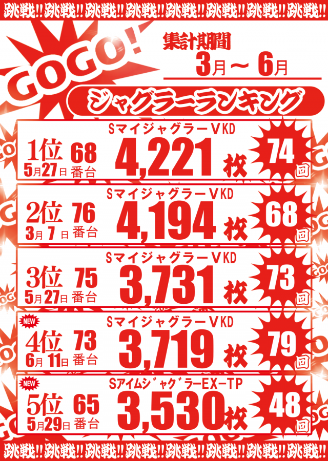 6月22日(木)ジャグランキング更新!本日もぜひご来店下さい
