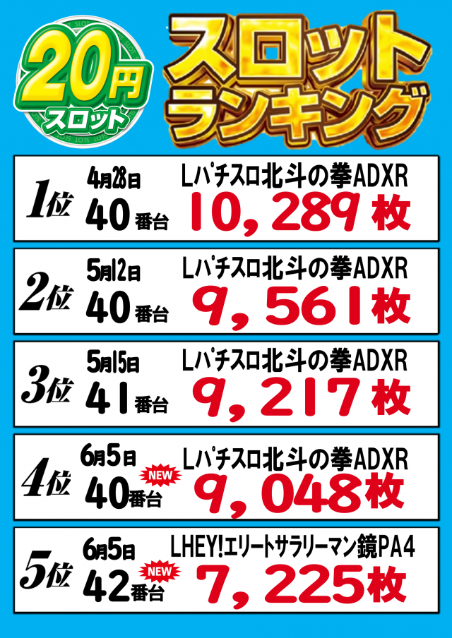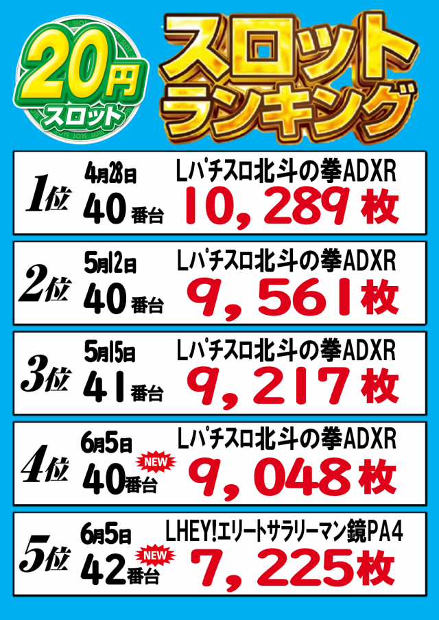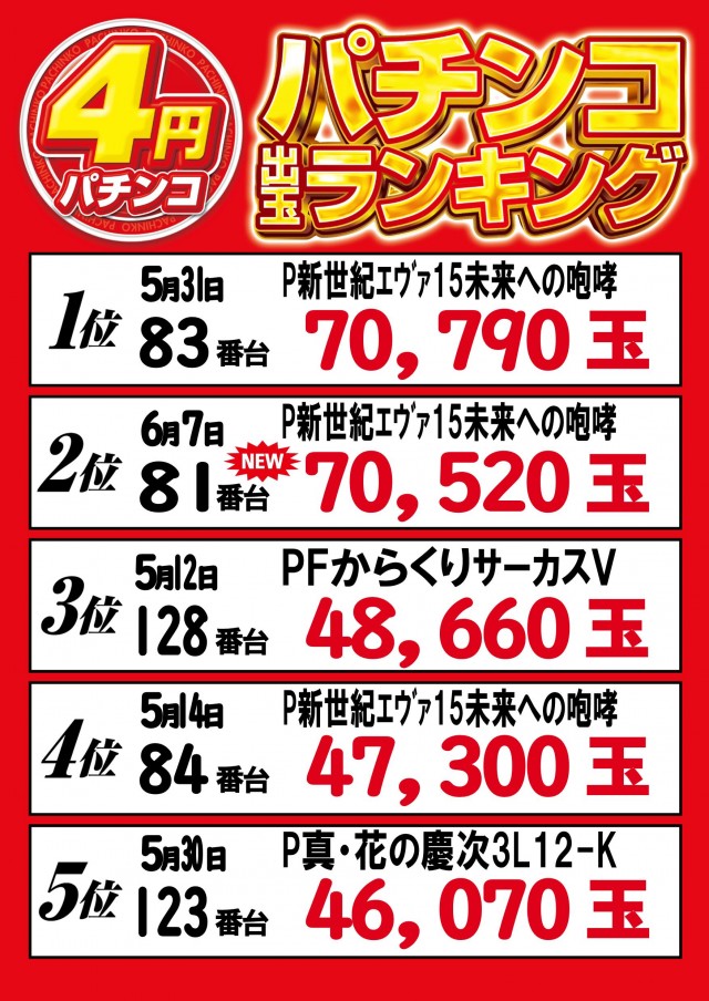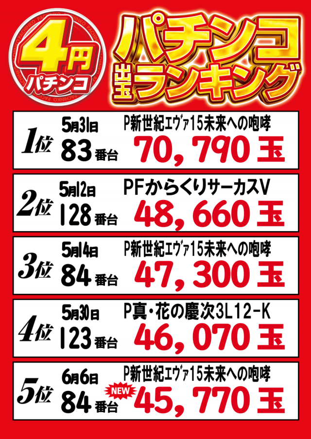 出玉ランキングのご案内!この後のご来店お待ちしております。