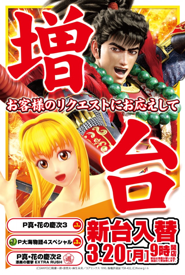 本日新台入替 大人気シリーズ花の慶次&海物語増台!