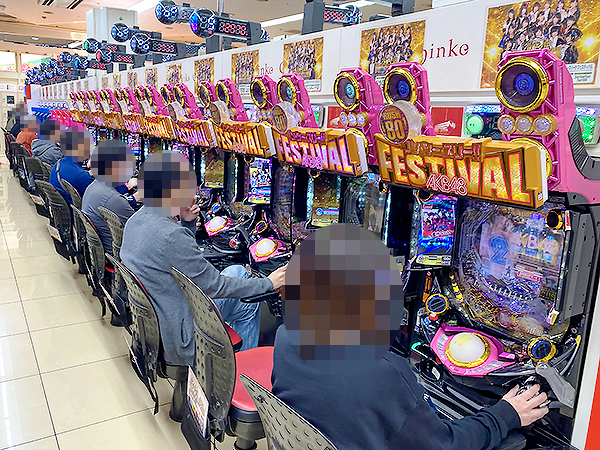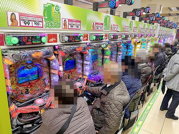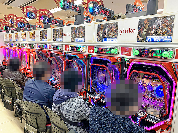 取材時は既に多くのプレイヤーが集結し、パチンコ・パチスロを問わずにぎやかな状況となっていた。