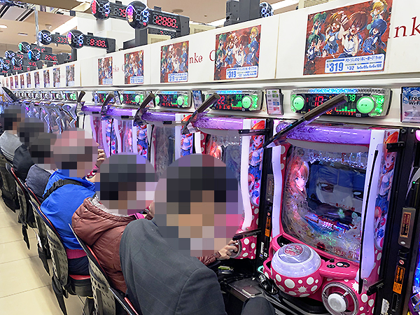 16時ごろの4円パチンコを見てみると「P花の慶次~蓮」や「Pひぐらしのなく頃に~廻~319ver.」が活況。プレイヤーの満足そうな表情から、充実した時間を過ごしていたことがうかがえる。