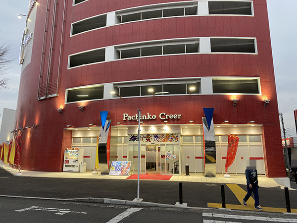 赤色の外観も特徴的な「パチンコクリエ十日市場店」で、「真双龍」を実施。