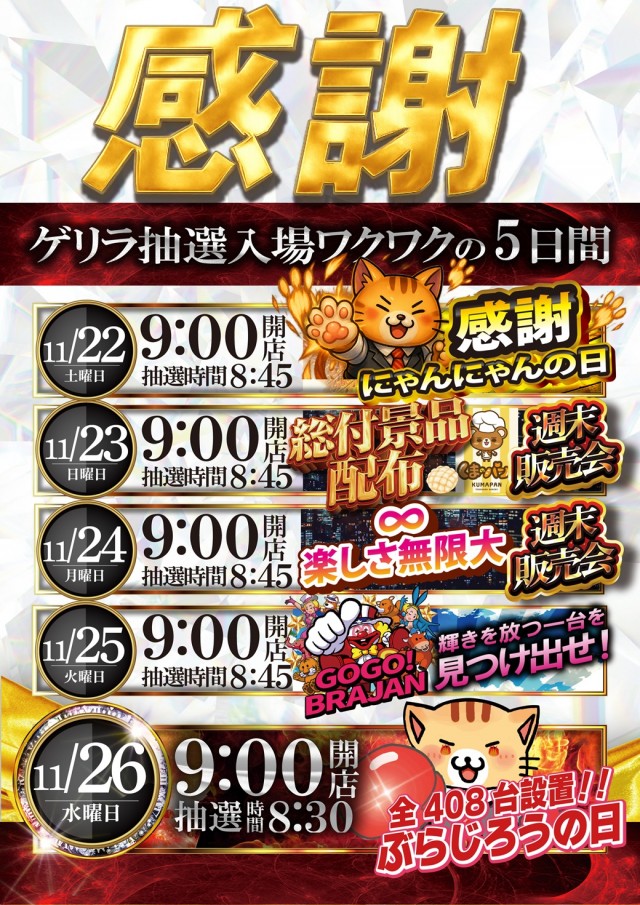 🌈ゲリラ抽選入 場開催決定🌈11月22日㊏8:45抽選開始