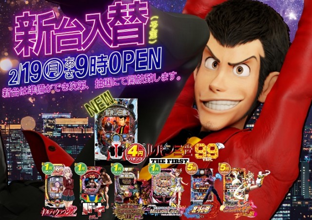 明日 2.20(火)🔥新台ルパン三世フルオープン🔥9時開店
